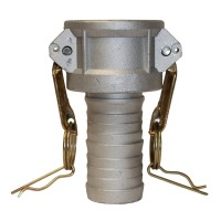 The Aluminum cam & groove coupling type C is a single coupling with a coupler on one end and a hose barb on the other. That is a Female Coupler x Hose barb connection. It is compatible with all male adaptors, including type A, E, F, and DP, and the DIN2828 standard type C hose end is smooth, allowing it to be assembled with a DIN2817 safety clamp.